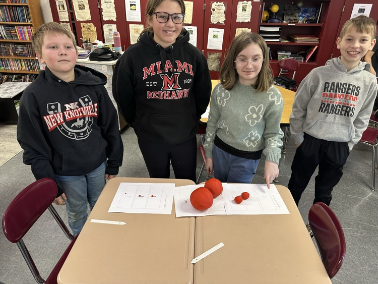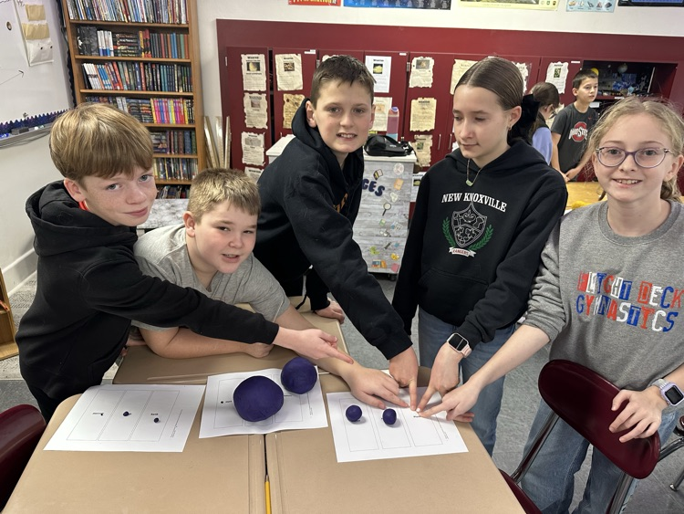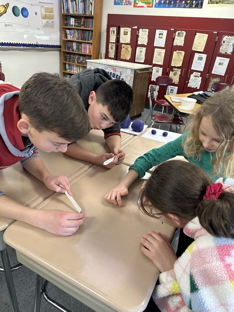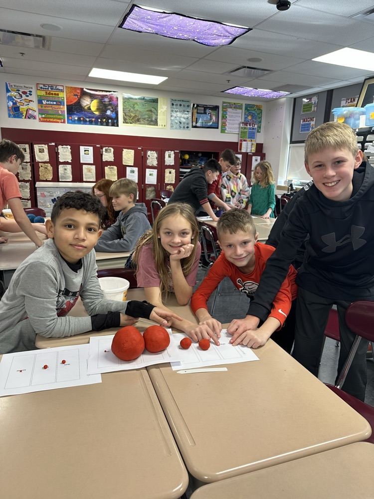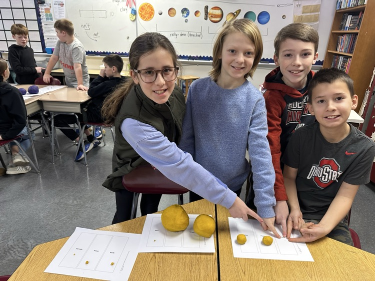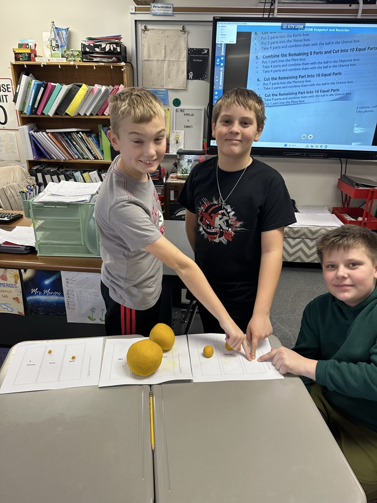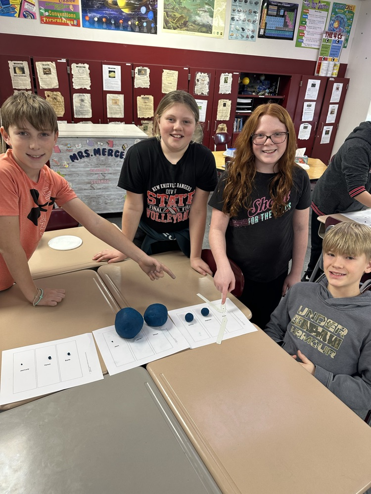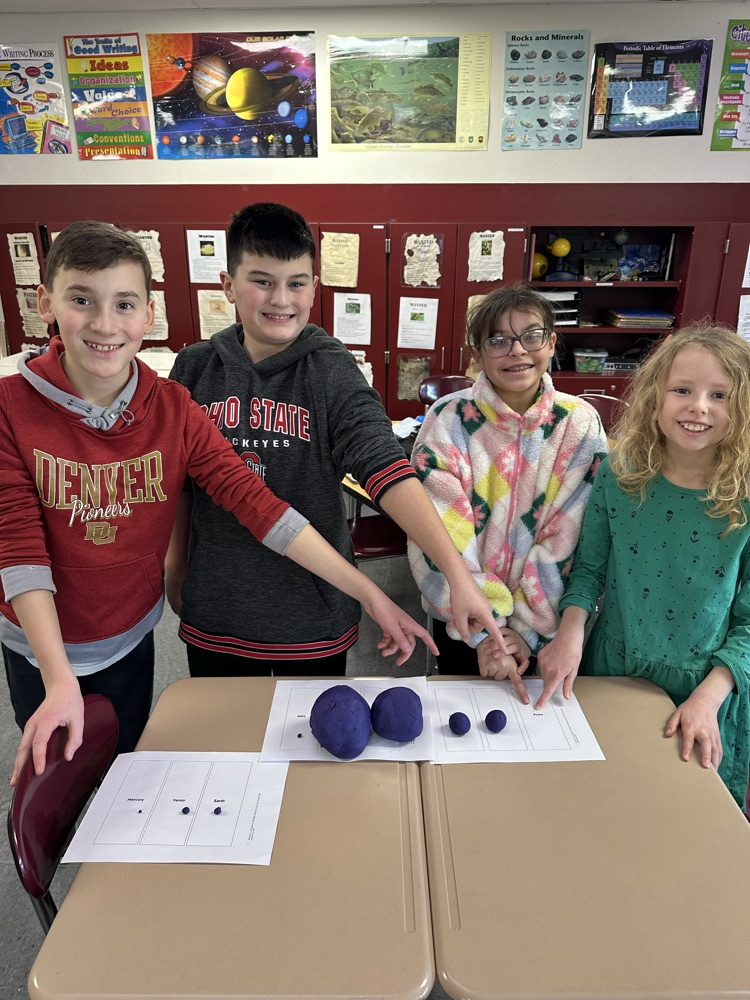 Fifth graders made the planets--including Pluto (the speck they are pointing to)--TO SCALE with Play-Doh. We couldn't make the Sun because it would take 1.3 million Earths!🌎🪐🌞